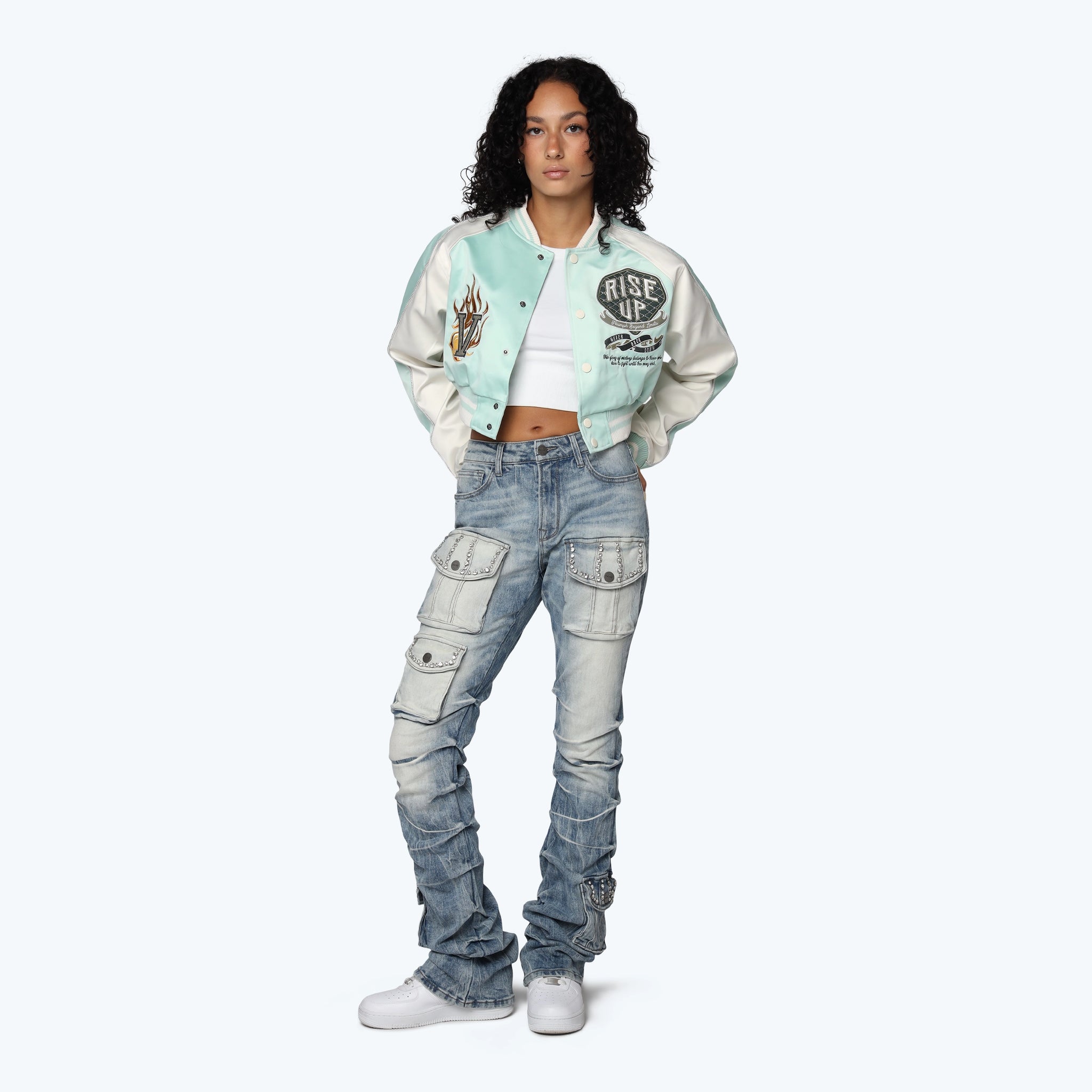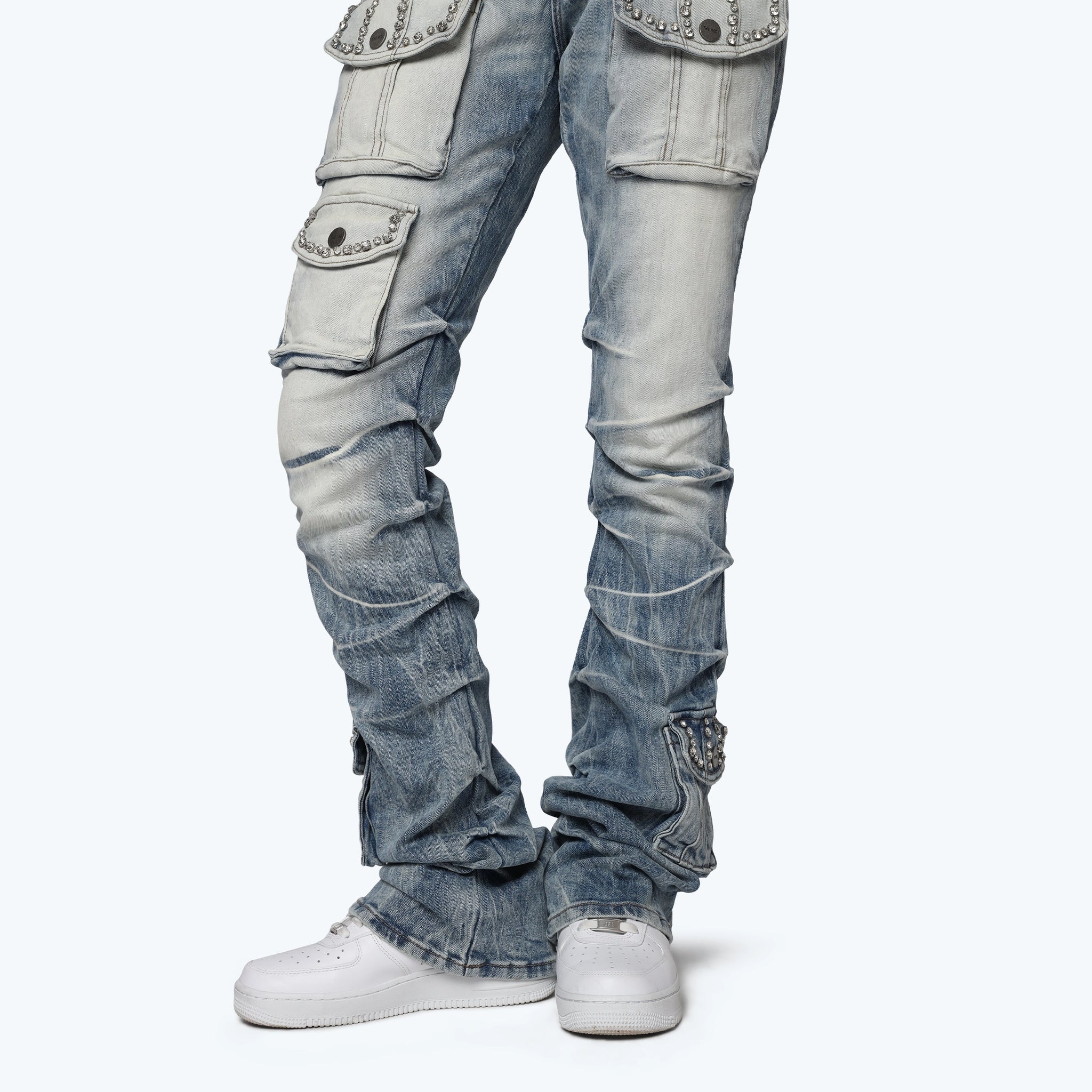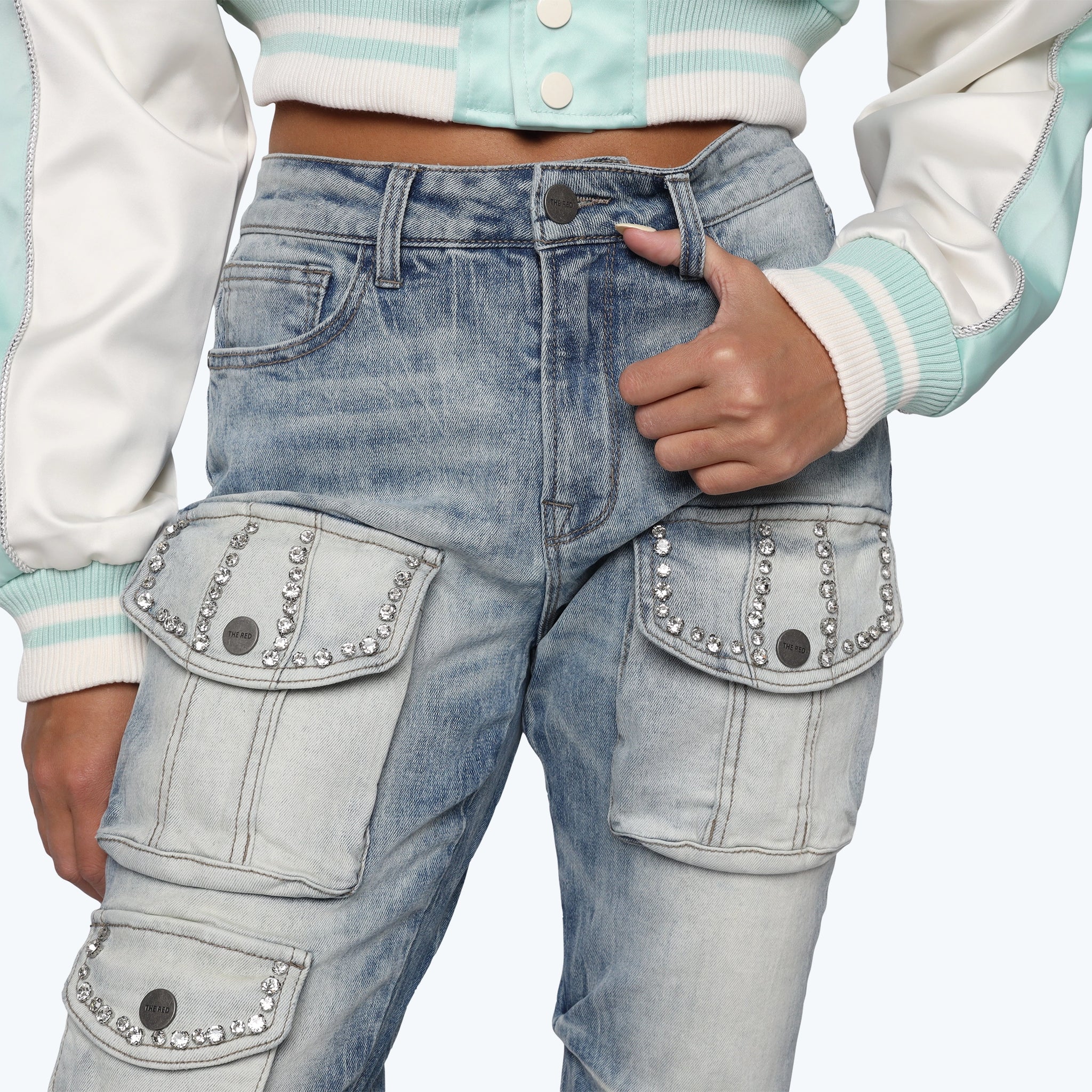 High Rise Stacked Rhinestone Jeans - Astrion Blue